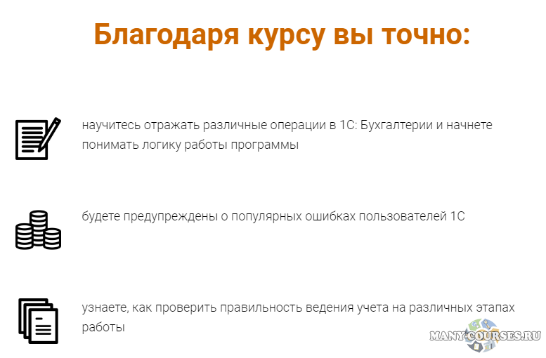 - Вы получите не просто механическую последовательность действий, а начнете понимать программу, будете предупреждены о популярных ошибках пользователей 1С и узнаете, как проверить правильность ведения учета на различных этапах работы!