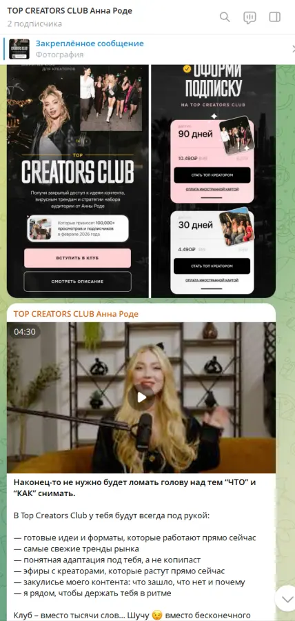 Вы находитесь на странице товара «Анна Роде - Top Creators club. Доступ 90 дней», это материал 2026 года, который, мы надеемся, принесет вам пользу. Данный курс расположен на платформе «Канал Telegram».Скриншоты с платформы на которой расположены материалы вы можете найти выше. В нашем магазине курсы доступны по самым выгодным ценам. Вы можете перейти на оригинальный продажник, после чего принять решение о покупке. Вы получаете этот курс, купив в нашем магазине MANY-COURSES.NET, с огромной скидкой, всего 1290 рублей. Обучающий курс входит в рубрику «Бизнес, менеджмент, продажи», вы можете поискать другие сливы курсов в этой рубрике. В нашем магазине Вы найдёте ещё много курсов от автора «Анна Роде», достаточно ввести в поиск имя автора.