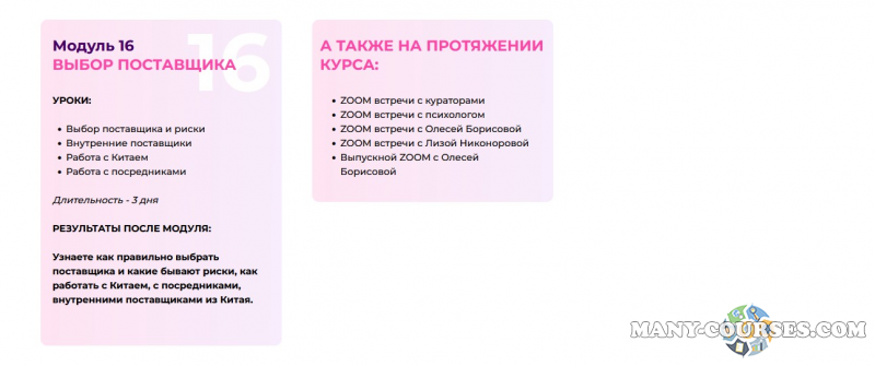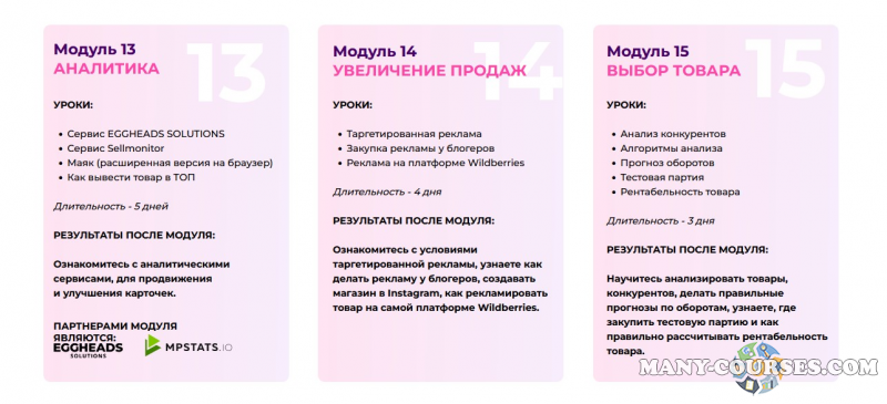 Вы находитесь на странице товара «Лиза Никонорова, Олеся Борисова - Менеджер маркетплейсов (2022)», это материал 2022 года, который, мы надеемся, принесет вам пользу. Скриншоты с платформы на которой расположены материалы вы можете найти выше. В нашем магазине курсы доступны по самым выгодным ценам. Вы можете перейти на оригинальный продажник, после чего принять решение о покупке. Если бы вы покупали у самого автора, то данный курс вам обошелся 1000 рублей. Вы получаете этот курс, купив в нашем магазине MANY-COURSES.NET, с огромной скидкой, всего 99 рублей. Обучающий курс входит в рубрику «Бизнес, менеджмент, продажи / Wildberries», вы можете поискать другие сливы курсов в этой рубрике. В нашем магазине Вы найдёте ещё много курсов от автора «Лиза Никонорова, Олеся Борисова», достаточно ввести в поиск имя автора.