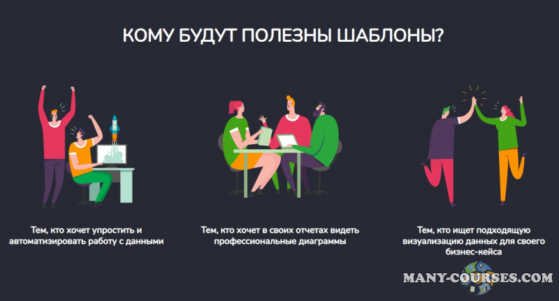 - Экономия времени. Подставляете свои данные в готовые решения, и профессиональные диаграммы уже украшают ваш отчет.
