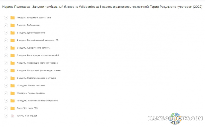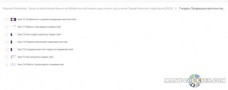Вы находитесь на странице товара «Марина Полетаева - Запусти прибыльный бизнес на Wildberries за 8 недель и расти весь год со мной. Тариф Результат с куратором (2022)», это материал 2022 года, который, мы надеемся, принесет вам пользу. Скриншоты с платформы на которой расположены материалы вы можете найти выше. В нашем магазине курсы доступны по самым выгодным ценам. Вы получаете этот курс, купив в нашем магазине MANY-COURSES.NET, с огромной скидкой, всего 99 рублей. Обучающий курс входит в рубрику «Бизнес, менеджмент, продажи», вы можете поискать другие сливы курсов в этой рубрике. В нашем магазине Вы найдёте ещё много курсов от автора «Марина Полетаева», достаточно ввести в поиск имя автора.