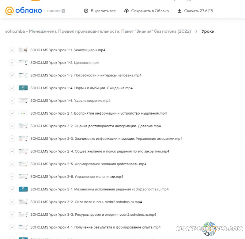 Вы находитесь на странице товара «soho.mba - Менеджмент. Предел производительности. Пакет Знания без потока», это материал 2022 года, который, мы надеемся, принесет вам пользу. Данный курс расположен на платформе «Облако Mail».Скриншоты с платформы на которой расположены материалы вы можете найти выше. В нашем магазине курсы доступны по самым выгодным ценам. Вы можете перейти на оригинальный продажник, после чего принять решение о покупке. Если бы вы покупали у самого автора, то данный курс вам обошелся 29990 рублей. Вы получаете этот курс, купив в нашем магазине MANY-COURSES.NET, с огромной скидкой, всего 250 рублей. Обучающий курс входит в рубрику «Бизнес, менеджмент, продажи», вы можете поискать другие сливы курсов в этой рубрике. В нашем магазине Вы найдёте ещё много курсов от автора «Михаил Уколов, Алина Уколова, Ольга Туржанская», достаточно ввести в поиск имя автора.