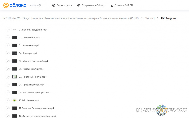 Вы находитесь на странице товара «NZTCoder/Mr-Grey - Телеграм-Хозяин: пассивный заработок на телеграм ботах и сетках каналов», это материал 2022 года, который, мы надеемся, принесет вам пользу. Скриншоты с платформы на которой расположены материалы вы можете найти выше. В нашем магазине курсы доступны по самым выгодным ценам. Вы получаете этот курс, купив в нашем магазине MANY-COURSES.NET, с огромной скидкой, всего 890 рублей. Обучающий курс входит в рубрику «Бизнес, менеджмент, продажи / Схемы заработка / Программирование», вы можете поискать другие сливы курсов в этой рубрике. В нашем магазине Вы найдёте ещё много курсов от автора «NZTCoder/Mr-Grey», достаточно ввести в поиск имя автора.