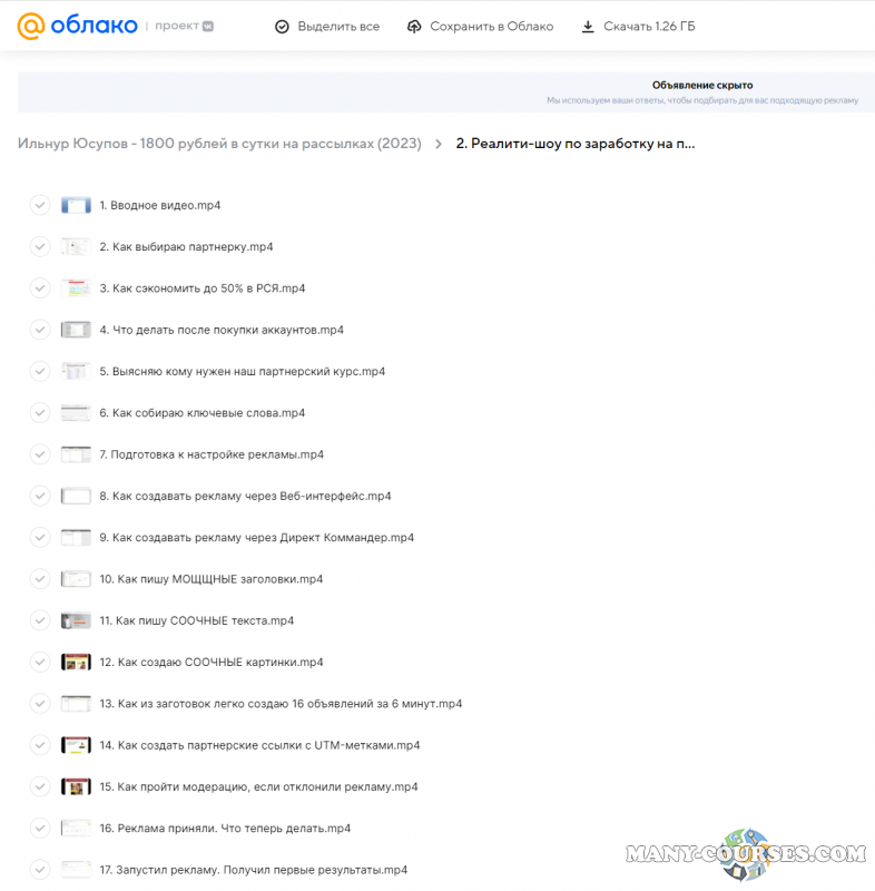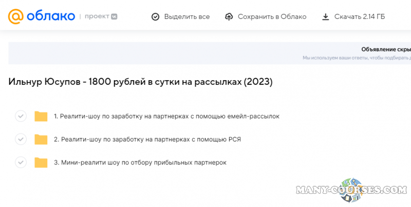 Вы находитесь на странице товара «Ильнур Юсупов - 1800 рублей в сутки на рассылках», это материал 2023 года, который, мы надеемся, принесет вам пользу. Данный курс расположен на платформе «Облако Mail».Скриншоты с платформы на которой расположены материалы вы можете найти выше. В нашем магазине курсы доступны по самым выгодным ценам. Вы получаете этот курс, купив в нашем магазине MANY-COURSES.NET, с огромной скидкой, всего 495 рублей. Обучающий курс входит в рубрику «Бизнес, менеджмент, продажи / Схемы заработка», вы можете поискать другие сливы курсов в этой рубрике. В нашем магазине Вы найдёте ещё много курсов от автора «Ильнур Юсупов», достаточно ввести в поиск имя автора.