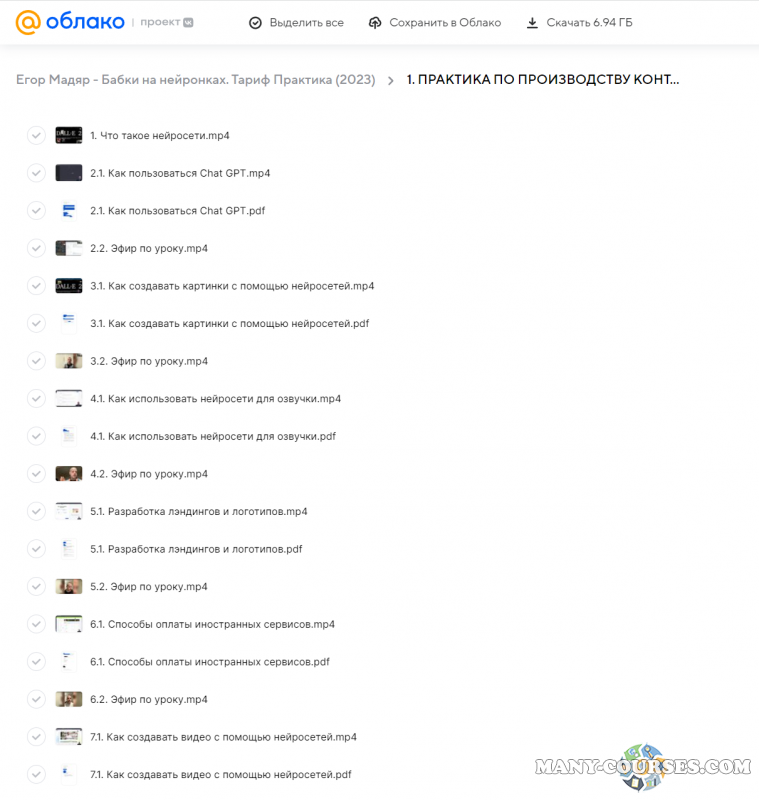 Вы находитесь на странице товара «Егор Мадяр - Бабки на нейронках. Тариф Практика (2023)», это материал 2023 года, который, мы надеемся, принесет вам пользу. Данный курс расположен на платформе «Облако Mail».Скриншоты с платформы на которой расположены материалы вы можете найти выше. В нашем магазине курсы доступны по самым выгодным ценам. Вы можете перейти на оригинальный продажник, после чего принять решение о покупке. Если бы вы покупали у самого автора, то данный курс вам обошелся 25000 рублей. Вы получаете этот курс, купив в нашем магазине MANY-COURSES.NET, с огромной скидкой, всего 500 рублей. Обучающий курс входит в рубрику «Бизнес, менеджмент, продажи / Схемы заработка», вы можете поискать другие сливы курсов в этой рубрике. В нашем магазине Вы найдёте ещё много курсов от автора «Егор Мадяр», достаточно ввести в поиск имя автора.