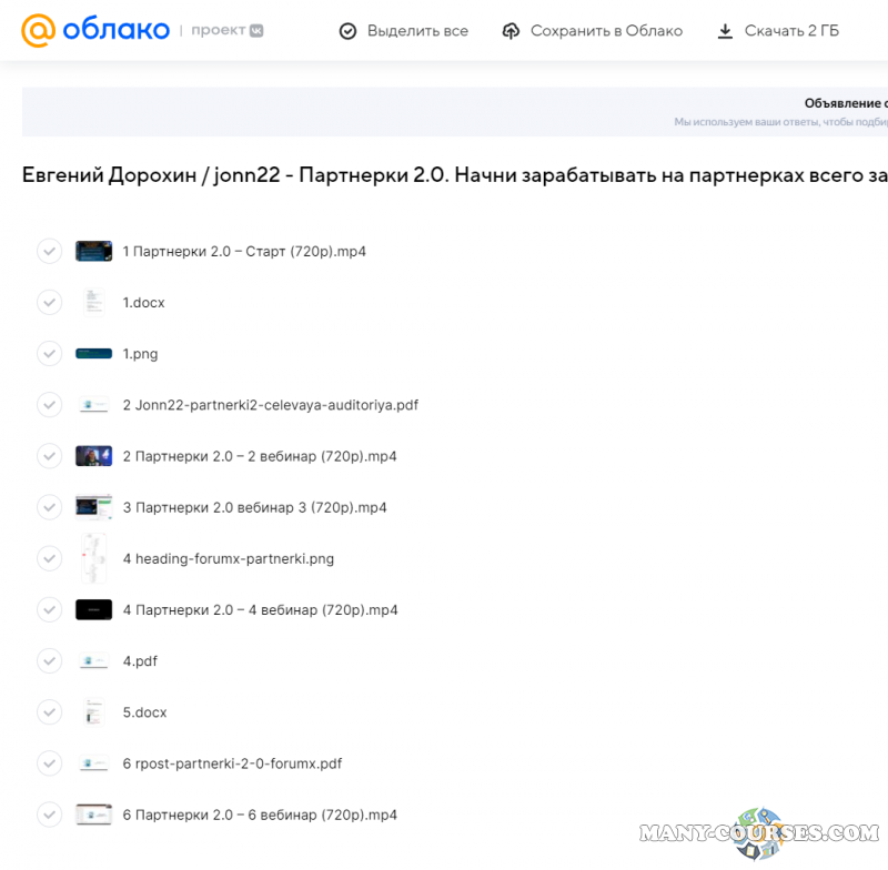 Вы находитесь на странице товара «Евгений Дорохин / jonn22 - Партнерки 2.0. Начни зарабатывать на партнерках всего за 3 недели», это материал 2023 года, который, мы надеемся, принесет вам пользу. Данный курс расположен на платформе «Облако Mail».Скриншоты с платформы на которой расположены материалы вы можете найти выше. В нашем магазине курсы доступны по самым выгодным ценам. Вы можете перейти на оригинальный продажник, после чего принять решение о покупке. Если бы вы покупали у самого автора, то данный курс вам обошелся 9900 рублей. Вы получаете этот курс, купив в нашем магазине MANY-COURSES.NET, с огромной скидкой, всего 100 рублей. Обучающий курс входит в рубрику «Бизнес, менеджмент, продажи / Схемы заработка», вы можете поискать другие сливы курсов в этой рубрике. В нашем магазине Вы найдёте ещё много курсов от автора «Евгений Дорохин», достаточно ввести в поиск имя автора.