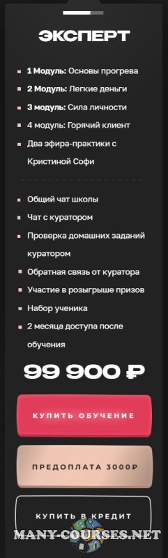 1 Модуль: Основы прогрева 2 Модуль: Легкие деньги 3 модуль: Сила личности 4 модуль: Горячий клиент Два эфира-практики с Кристиной Софи