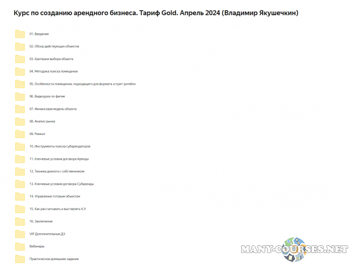 Вы находитесь на странице товара «Владимир Якушечкин - Курс по созданию арендного бизнеса. Тариф Gold. Апрель 2024», это материал 2024 года, который, мы надеемся, принесет вам пользу. Данный курс расположен на платформе «Яндекс Диск».Скриншоты с платформы на которой расположены материалы вы можете найти выше. В нашем магазине курсы доступны по самым выгодным ценам. Если бы вы покупали у самого автора, то данный курс вам обошелся 1000000 рублей. Вы получаете этот курс, купив в нашем магазине MANY-COURSES.NET, с огромной скидкой, всего 3990 рублей. Обучающий курс входит в рубрику «Бизнес, менеджмент, продажи», вы можете поискать другие сливы курсов в этой рубрике. В нашем магазине Вы найдёте ещё много курсов от автора «Владимир Якушечкин», достаточно ввести в поиск имя автора.