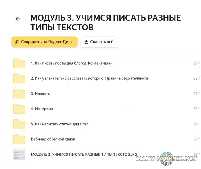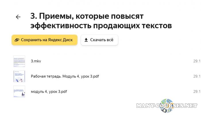 Вы находитесь на странице товара «Надежда Сокирская - Научись писать вовлекающие, яркие, убедительные тексты и зарабатывать на этом», это материал который, мы надеемся, принесет вам пользу. Данный курс расположен на платформе «Яндекс Диск».Скриншоты с платформы на которой расположены материалы вы можете найти выше. В нашем магазине курсы доступны по самым выгодным ценам. Если бы вы покупали у самого автора, то данный курс вам обошелся 45000 рублей. Вы получаете этот курс, купив в нашем магазине MANY-COURSES.NET, с огромной скидкой, всего 600 рублей. Обучающий курс входит в рубрику «Бизнес, менеджмент, продажи», вы можете поискать другие сливы курсов в этой рубрике. В нашем магазине Вы найдёте ещё много курсов от автора «Надежда Сокирская», достаточно ввести в поиск имя автора.