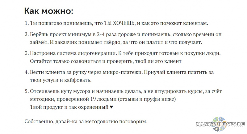 - Отсеиваешь кучу мусора и начинаешь делать, а не штудировать курсы, за счёт методики, проверенной 19 людьми (отзывы и пруфы ниже)