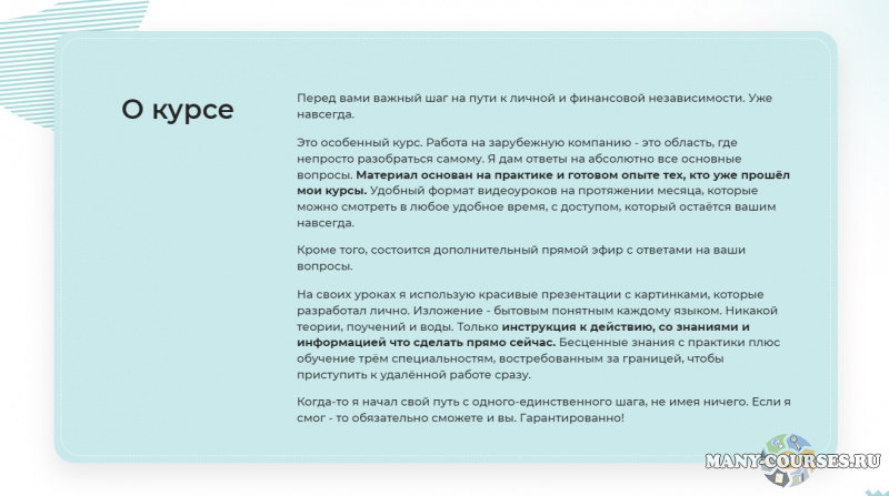 Вы находитесь на странице товара «Михаил Зарубин - Работа из дома на зарубежные компании 2.0. Обучение профессиям. Иммиграция», это материал 2021 года, который, мы надеемся, принесет вам пользу. Данный курс расположен на платформе «Облако Mail».Скриншоты с платформы на которой расположены материалы вы можете найти выше. В нашем магазине курсы доступны по самым выгодным ценам. Вы можете перейти на оригинальный продажник, после чего принять решение о покупке. Если бы вы покупали у самого автора, то данный курс вам обошелся 4000 рублей. Вы получаете этот курс, купив в нашем магазине MANY-COURSES.NET, с огромной скидкой, всего 100 рублей. Обучающий курс входит в рубрику «Бизнес, менеджмент, продажи», вы можете поискать другие сливы курсов в этой рубрике. В нашем магазине Вы найдёте ещё много курсов от автора «Михаил Зарубин», достаточно ввести в поиск имя автора.