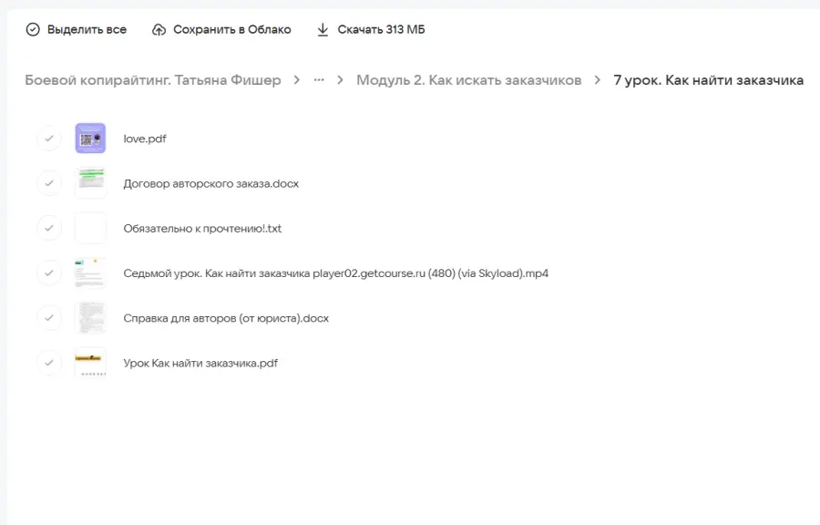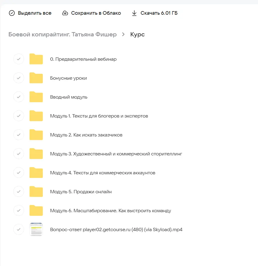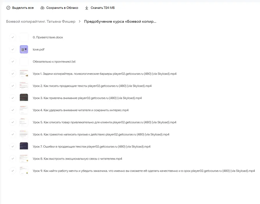 Вы находитесь на странице товара «Татьяна Фишер - Боевой копирайтинг. Тариф - Все, что входит с обратной связью», это материал 2021 года, который, мы надеемся, принесет вам пользу. Данный курс расположен на платформе «Облако Mail».Скриншоты с платформы на которой расположены материалы вы можете найти выше. В нашем магазине курсы доступны по самым выгодным ценам. Вы можете перейти на оригинальный продажник, после чего принять решение о покупке. Если бы вы покупали у самого автора, то данный курс вам обошелся 29900 рублей. Вы получаете этот курс, купив в нашем магазине MANY-COURSES.NET, с огромной скидкой, всего 500 рублей. Обучающий курс входит в рубрику «Бизнес, менеджмент, продажи», вы можете поискать другие сливы курсов в этой рубрике. В нашем магазине Вы найдёте ещё много курсов от автора «Татьяна Фишер», достаточно ввести в поиск имя автора.