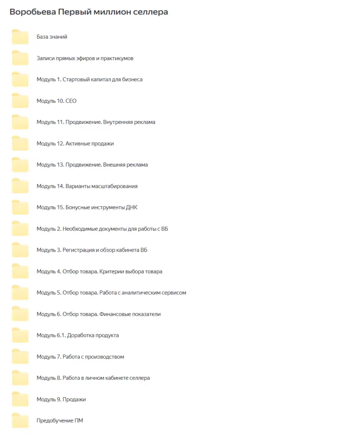 Вы находитесь на странице товара «Эльвира Воробьева - Первый миллион селлера», это материал который, мы надеемся, принесет вам пользу. Данный курс расположен на платформе «Яндекс Диск».Скриншоты с платформы на которой расположены материалы вы можете найти выше. В нашем магазине курсы доступны по самым выгодным ценам. Вы можете перейти на оригинальный продажник, после чего принять решение о покупке. Если бы вы покупали у самого автора, то данный курс вам обошелся 150000 рублей. Вы получаете этот курс, купив в нашем магазине MANY-COURSES.NET, с огромной скидкой, всего 3990 рублей. Обучающий курс входит в рубрику «Бизнес, менеджмент, продажи / Маркетплейсы / Wildberries», вы можете поискать другие сливы курсов в этой рубрике. В нашем магазине Вы найдёте ещё много курсов от автора «Эльвира Воробьева», достаточно ввести в поиск имя автора.