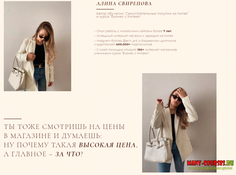 Автор обучалки "Самостоятельные покупки из Китая" и курса "Бизнес с Китаем"– Опыт работы с китайскими сайтами более 7 лет– Успешный интернет-магазин с одеждой из Китая– Instgram-блогер @alin_arti о бюджетном шоппинге с аудиторией 400.000+ подписчиков– С моей помощью открыто 150+ интернет-магазинов учениками курса "Бизнес с Китаем