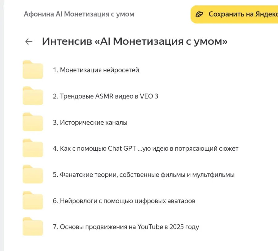 Вы находитесь на странице товара «Ирина Афонина - AI Монетизация с умом (2025)», это материал 2025 года, который, мы надеемся, принесет вам пользу. Данный курс расположен на платформе «Яндекс Диск».Скриншоты с платформы на которой расположены материалы вы можете найти выше. В нашем магазине курсы доступны по самым выгодным ценам. Вы получаете этот курс, купив в нашем магазине MANY-COURSES.NET, с огромной скидкой, всего 879 рублей. Обучающий курс входит в рубрику «Нейросети / SEO и SMM», вы можете поискать другие сливы курсов в этой рубрике. В нашем магазине Вы найдёте ещё много курсов от автора «Ирина Афонина», достаточно ввести в поиск имя автора.
