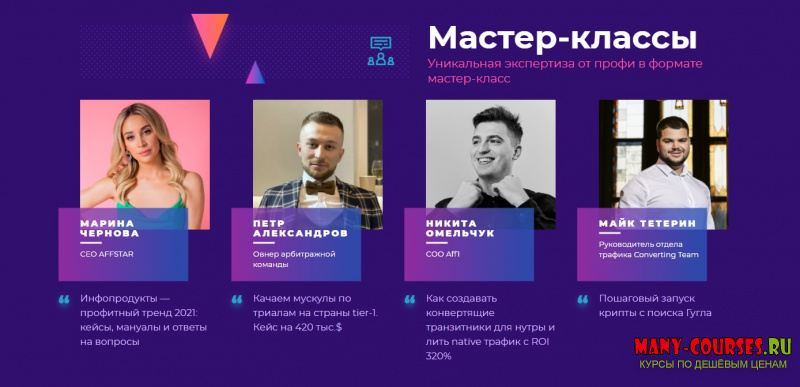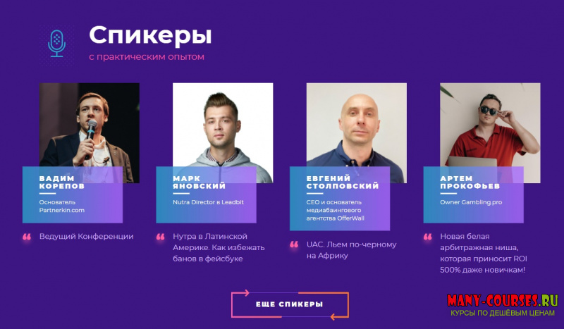 Вы находитесь на странице товара «Moscow affiliate conference (2021) - В. Корепов, В. Гармаш, А. Слобоженко, А. Сибирский и др.», это материал 2021 года, который, мы надеемся, принесет вам пользу. Скриншоты с платформы на которой расположены материалы вы можете найти выше. В нашем магазине курсы доступны по самым выгодным ценам. Вы можете перейти на оригинальный продажник, после чего принять решение о покупке. Если бы вы покупали у самого автора, то данный курс вам обошелся 4880 рублей. Вы получаете этот курс, купив в нашем магазине MANY-COURSES.NET, с огромной скидкой, всего 99 рублей. Обучающий курс входит в рубрику «Реклама и маркетинг», вы можете поискать другие сливы курсов в этой рубрике. В нашем магазине Вы найдёте ещё много курсов от автора «В. Корепов, В. Гармаш, А. Слобоженко, А. Сибирский и др.», достаточно ввести в поиск имя автора.
