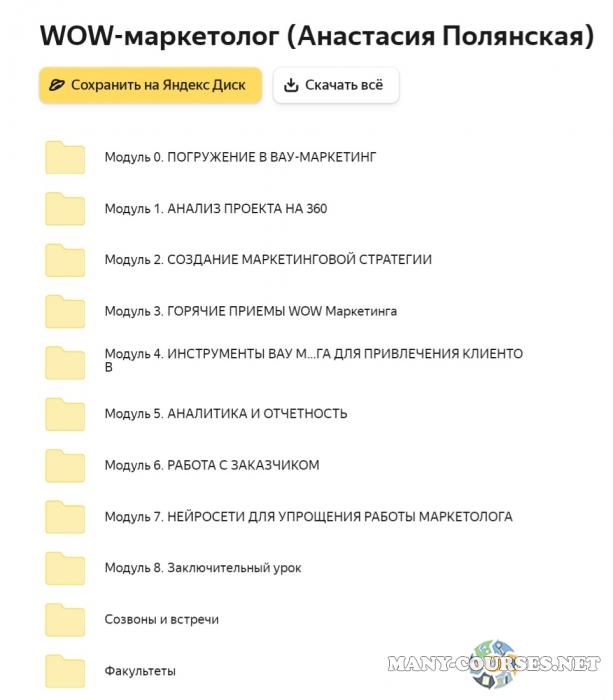 Вы находитесь на странице товара «Анастасия Полянская - WOW-маркетолог. Поток 6. Тариф PRO (2025)», это материал 2025 года, который, мы надеемся, принесет вам пользу. Данный курс расположен на платформе «Яндекс Диск».Скриншоты с платформы на которой расположены материалы вы можете найти выше. В нашем магазине курсы доступны по самым выгодным ценам. Вы можете перейти на оригинальный продажник, после чего принять решение о покупке. Вы получаете этот курс, купив в нашем магазине MANY-COURSES.NET, с огромной скидкой, всего 4690 рублей. Обучающий курс входит в рубрику «Реклама и маркетинг / SEO и SMM», вы можете поискать другие сливы курсов в этой рубрике. В нашем магазине Вы найдёте ещё много курсов от автора «Анастасия Полянская», достаточно ввести в поиск имя автора.