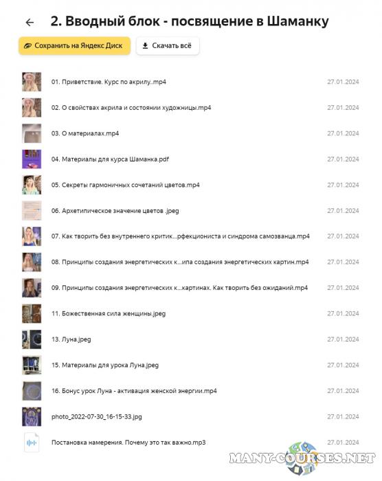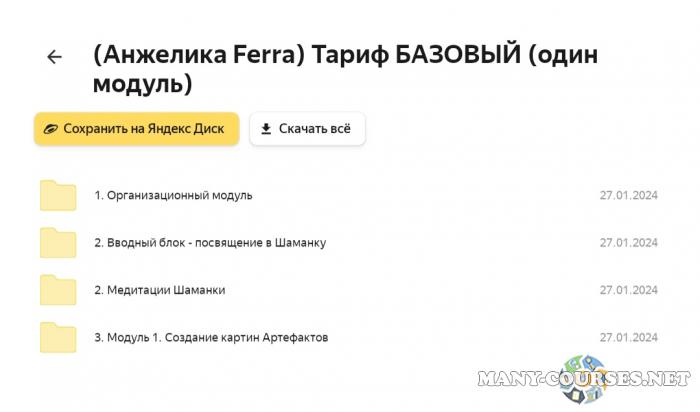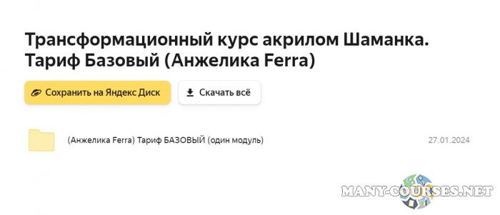 Вы находитесь на странице товара «Анжелика Ferra - Трансформационный курс акрилом Шаманка. Тариф Базовый», это материал 2022 года, который, мы надеемся, принесет вам пользу. Данный курс расположен на платформе «Яндекс Диск».Скриншоты с платформы на которой расположены материалы вы можете найти выше. В нашем магазине курсы доступны по самым выгодным ценам. Вы можете перейти на оригинальный продажник, после чего принять решение о покупке. Если бы вы покупали у самого автора, то данный курс вам обошелся 33800 рублей. Вы получаете этот курс, купив в нашем магазине MANY-COURSES.NET, с огромной скидкой, всего 390 рублей. Обучающий курс входит в рубрику «Графика и Дизайн / Эзотерика и оккультизм», вы можете поискать другие сливы курсов в этой рубрике. В нашем магазине Вы найдёте ещё много курсов от автора «Анжелика Ferra», достаточно ввести в поиск имя автора.