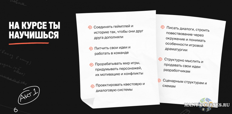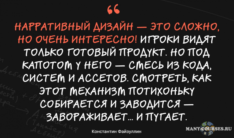 - Писать диалоги, строить повествование через окружение и понимать особенности игровой драматургии
