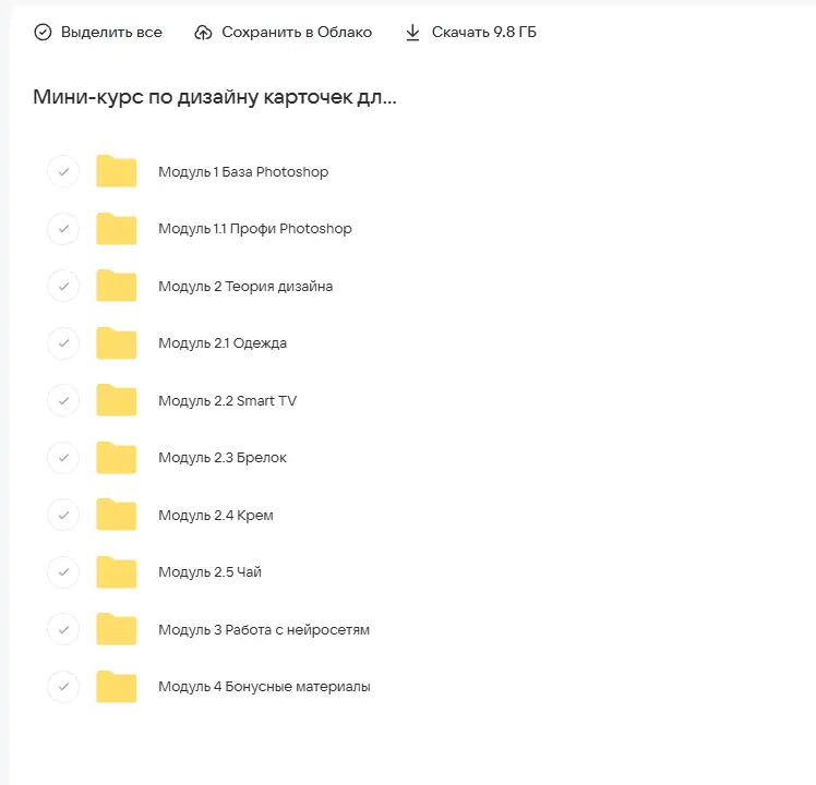 Вы находитесь на странице товара «Настя Greech - Мини-курс по дизайну карточек для Wildberries. Тариф Просто глянуть», это материал который, мы надеемся, принесет вам пользу. Данный курс расположен на платформе «Облако Mail».Скриншоты с платформы на которой расположены материалы вы можете найти выше. В нашем магазине курсы доступны по самым выгодным ценам. Вы можете перейти на оригинальный продажник, после чего принять решение о покупке. Если бы вы покупали у самого автора, то данный курс вам обошелся 9990 рублей. Вы получаете этот курс, купив в нашем магазине MANY-COURSES.NET, с огромной скидкой, всего 750 рублей. Обучающий курс входит в рубрику «Графика и Дизайн», вы можете поискать другие сливы курсов в этой рубрике. В нашем магазине Вы найдёте ещё много курсов от автора «Настя Greech», достаточно ввести в поиск имя автора.