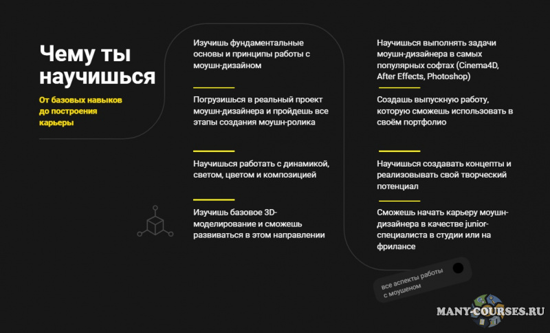 - Научишься выполнять задачи моушн-дизайнера в самых популярных софтах (Cinema4D, After Effects, Photoshop)