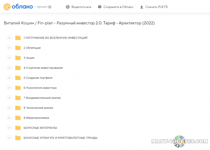 Вы находитесь на странице товара «Виталий Кошин / Fin-plan - Разумный инвестор 2.0. Тариф - Архитектор», это материал 2022 года, который, мы надеемся, принесет вам пользу. Данный курс расположен на платформе «Облако Mail».Скриншоты с платформы на которой расположены материалы вы можете найти выше. В нашем магазине курсы доступны по самым выгодным ценам. Вы можете перейти на оригинальный продажник, после чего принять решение о покупке. Вы получаете этот курс, купив в нашем магазине MANY-COURSES.NET, с огромной скидкой, всего 650 рублей. Обучающий курс входит в рубрику «Инвестиции, Трейдинг, Криптовалюта», вы можете поискать другие сливы курсов в этой рубрике. В нашем магазине Вы найдёте ещё много курсов от автора «Виталий Кошин», достаточно ввести в поиск имя автора.