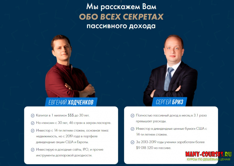 Вы находитесь на странице товара «Евгений Ходченков, Сергей Бриз - Пассивный доход на автомате», это материал 2021 года, который, мы надеемся, принесет вам пользу. Данный курс расположен на платформе «Облако Mail».Скриншоты с платформы на которой расположены материалы вы можете найти выше. В нашем магазине курсы доступны по самым выгодным ценам. Вы можете перейти на оригинальный продажник, после чего принять решение о покупке. Если бы вы покупали у самого автора, то данный курс вам обошелся 14000 рублей. Вы получаете этот курс, купив в нашем магазине MANY-COURSES.NET, с огромной скидкой, всего 100 рублей. Обучающий курс входит в рубрику «Инвестиции, Трейдинг, Криптовалюта», вы можете поискать другие сливы курсов в этой рубрике. В нашем магазине Вы найдёте ещё много курсов от автора «Евгений Ходченков, Сергей Бриз», достаточно ввести в поиск имя автора.
