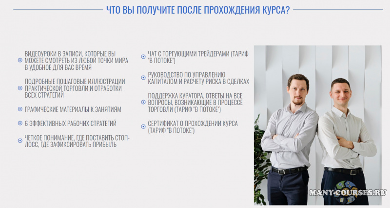 Вместе с вами мы ставим цель улучшить ваши практические навыки торговли. Вы вырабатываете вашу собственную торговую систему на основе алгоритмов и стратегий, описанных в курсе. Вы улучшаете дисциплину и оттачиваете свою систему входа и выхода из сделок.
