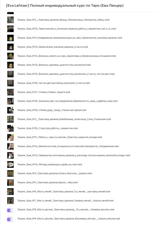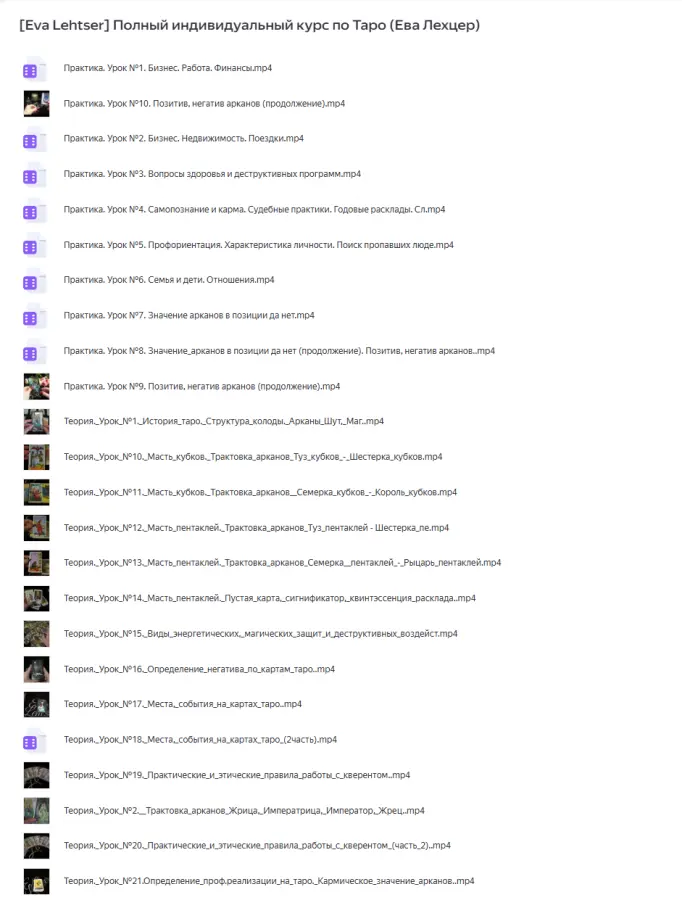 Вы находитесь на странице товара «Eva Lehtser / Ева Лехцер - Полный индивидуальный курс по Таро», это материал который, мы надеемся, принесет вам пользу. Данный курс расположен на платформе «Яндекс Диск».Скриншоты с платформы на которой расположены материалы вы можете найти выше. В нашем магазине курсы доступны по самым выгодным ценам. Вы можете перейти на оригинальный продажник, после чего принять решение о покупке. Вы получаете этот курс, купив в нашем магазине MANY-COURSES.NET, с огромной скидкой, всего 890 рублей. Обучающий курс входит в рубрику «Эзотерика и оккультизм», вы можете поискать другие сливы курсов в этой рубрике. В нашем магазине Вы найдёте ещё много курсов от автора «Ева Лехцер», достаточно ввести в поиск имя автора.