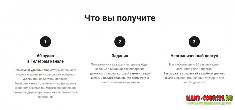 - Задания. Практически к каждому материалу будет задание с техникой для внедрения денежного закона, который изменит вашу жизнь и введет правильную привычку, а значит изменит вашу жизнь.