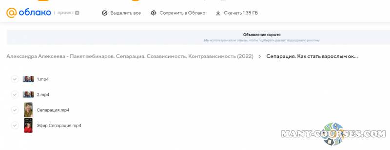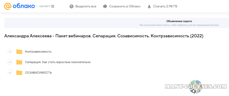 Вы находитесь на странице товара «Александра Алексеева - Пакет вебинаров. Сепарация. Созависимость. Контрзависимость (2022)», это материал 2023 года, который, мы надеемся, принесет вам пользу. Данный курс расположен на платформе «Яндекс Диск».Скриншоты с платформы на которой расположены материалы вы можете найти выше. В нашем магазине курсы доступны по самым выгодным ценам. Вы получаете этот курс, купив в нашем магазине MANY-COURSES.NET, с огромной скидкой, всего 349 рублей. Обучающий курс входит в рубрику «Эзотерика и оккультизм / Психология», вы можете поискать другие сливы курсов в этой рубрике. В нашем магазине Вы найдёте ещё много курсов от автора «Александра Алексеева», достаточно ввести в поиск имя автора.