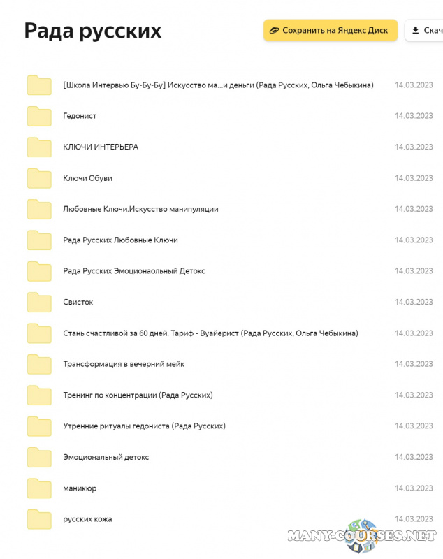 Вы находитесь на странице товара «Рада Русских - Комплект из 15 курсов», это материал который, мы надеемся, принесет вам пользу. Данный курс расположен на платформе «Яндекс Диск».Скриншоты с платформы на которой расположены материалы вы можете найти выше. В нашем магазине курсы доступны по самым выгодным ценам. Вы получаете этот курс, купив в нашем магазине MANY-COURSES.NET, с огромной скидкой, всего 1190 рублей. Обучающий курс входит в рубрику «Эзотерика и оккультизм / Психология / Стиль и имидж», вы можете поискать другие сливы курсов в этой рубрике. В нашем магазине Вы найдёте ещё много курсов от автора «Рада Русских», достаточно ввести в поиск имя автора.