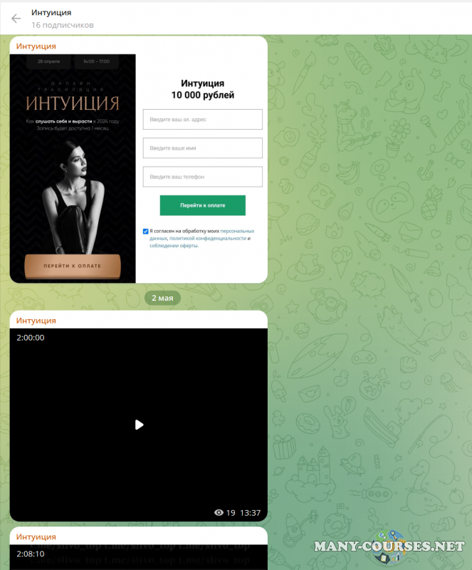 Вы находитесь на странице товара «Карина Исхакова - Интуиция», это материал 2024 года, который, мы надеемся, принесет вам пользу. Данный курс расположен на платформе «Канал Telegram».Скриншоты с платформы на которой расположены материалы вы можете найти выше. В нашем магазине курсы доступны по самым выгодным ценам. Если бы вы покупали у самого автора, то данный курс вам обошелся 10000 рублей. Вы получаете этот курс, купив в нашем магазине MANY-COURSES.NET, с огромной скидкой, всего 450 рублей. Обучающий курс входит в рубрику «Эзотерика и оккультизм / Психология», вы можете поискать другие сливы курсов в этой рубрике. В нашем магазине Вы найдёте ещё много курсов от автора «Карина Исхакова», достаточно ввести в поиск имя автора.