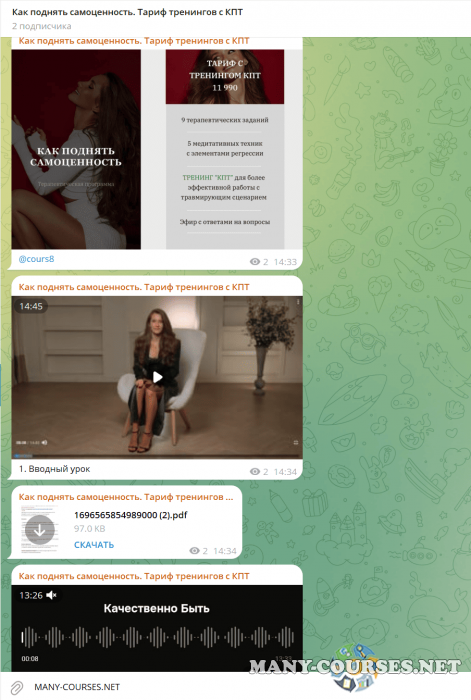 Вы находитесь на странице товара «vladislavatvs - Как поднять самоценность. Тариф С тренингом КПТ», это материал 2024 года, который, мы надеемся, принесет вам пользу. Данный курс расположен на платформе «Канал Telegram».Скриншоты с платформы на которой расположены материалы вы можете найти выше. В нашем магазине курсы доступны по самым выгодным ценам. Вы можете перейти на оригинальный продажник, после чего принять решение о покупке. Если бы вы покупали у самого автора, то данный курс вам обошелся 14990 рублей. Вы получаете этот курс, купив в нашем магазине MANY-COURSES.NET, с огромной скидкой, всего 870 рублей. Обучающий курс входит в рубрику «Эзотерика и оккультизм / Психология», вы можете поискать другие сливы курсов в этой рубрике. В нашем магазине Вы найдёте ещё много курсов от автора «vladislavatvs», достаточно ввести в поиск имя автора.
