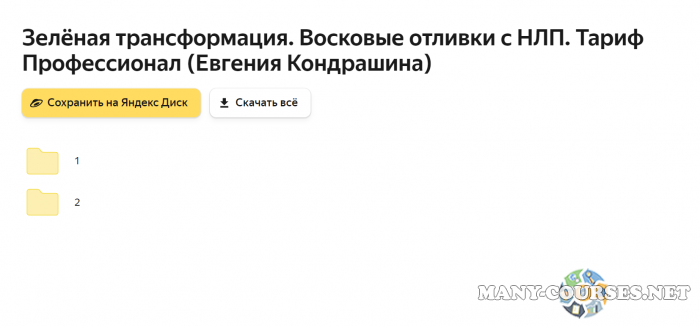 Вы находитесь на странице товара «Евгения Кондрашина - Зелёная трансформация. Восковые отливки с НЛП. Тариф Профессионал», это материал 2023 года, который, мы надеемся, принесет вам пользу. Данный курс расположен на платформе «Яндекс Диск».Скриншоты с платформы на которой расположены материалы вы можете найти выше. В нашем магазине курсы доступны по самым выгодным ценам. Вы можете перейти на оригинальный продажник, после чего принять решение о покупке. Если бы вы покупали у самого автора, то данный курс вам обошелся 34790 рублей. Вы получаете этот курс, купив в нашем магазине MANY-COURSES.NET, с огромной скидкой, всего 300 рублей. Обучающий курс входит в рубрику «Эзотерика и оккультизм», вы можете поискать другие сливы курсов в этой рубрике. В нашем магазине Вы найдёте ещё много курсов от автора «Евгения Кондрашина», достаточно ввести в поиск имя автора.