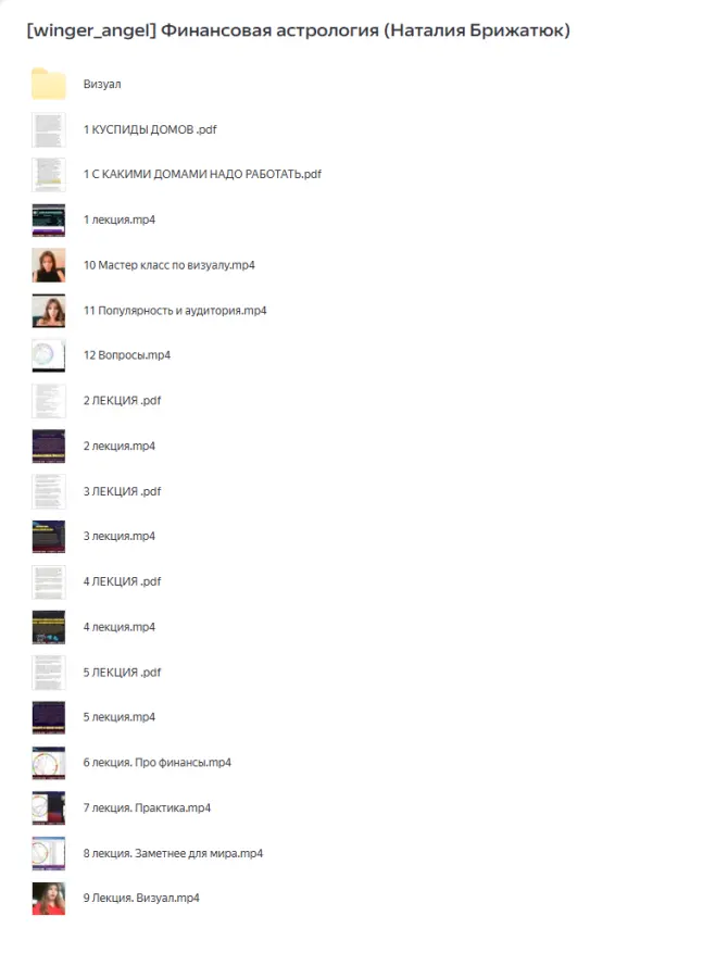 Вы находитесь на странице товара «winger_angel / Наталия Брижатюк - Финансовая астрология», это материал который, мы надеемся, принесет вам пользу. Данный курс расположен на платформе «Яндекс Диск».Скриншоты с платформы на которой расположены материалы вы можете найти выше. В нашем магазине курсы доступны по самым выгодным ценам. Вы можете перейти на оригинальный продажник, после чего принять решение о покупке. Если бы вы покупали у самого автора, то данный курс вам обошелся 99999 рублей. Вы получаете этот курс, купив в нашем магазине MANY-COURSES.NET, с огромной скидкой, всего 1390 рублей. Обучающий курс входит в рубрику «Эзотерика и оккультизм / Астрология», вы можете поискать другие сливы курсов в этой рубрике. В нашем магазине Вы найдёте ещё много курсов от автора «Наталия Брижатюк», достаточно ввести в поиск имя автора.