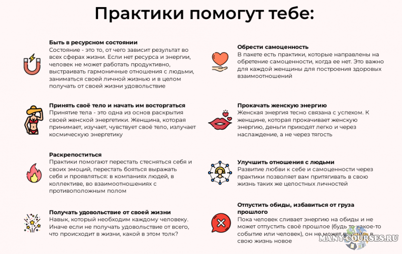 В пакете есть практики, которые направлены на обретение самоценности, когда ее нет. Это важно для каждой женщины для построения здоровых взаимоотношений