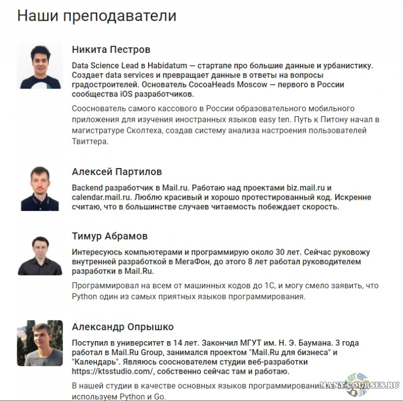 Поступил в университет в 14 лет. Закончил МГУТ им. Н. Э. Баумана. 3 года работал в Mail.Ru Group, занимался проекта "Mail.Ru для бизнеса" и "Календарь". Являюсь сооснователем студии веб-разработки https://ktsstudio.com/, собственно сейчас там и работаю. В нашей студии в качестве основных языков программирования на бэкэнде используем Python и Go.