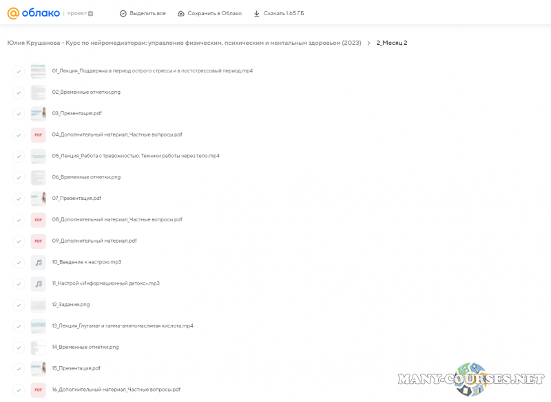 Вы находитесь на странице товара «Юлия Крушанова - Курс по нейромедиаторам: управление физическим, психическим и ментальным здоровьем (2023)», это материал 2023 года, который, мы надеемся, принесет вам пользу. Данный курс расположен на платформе «Облако Mail».Скриншоты с платформы на которой расположены материалы вы можете найти выше. В нашем магазине курсы доступны по самым выгодным ценам. Вы можете перейти на оригинальный продажник, после чего принять решение о покупке. Если бы вы покупали у самого автора, то данный курс вам обошелся 46000 рублей. Вы получаете этот курс, купив в нашем магазине MANY-COURSES.NET, с огромной скидкой, всего 270 рублей. Обучающий курс входит в рубрику «Психология / Эзотерика и оккультизм», вы можете поискать другие сливы курсов в этой рубрике. В нашем магазине Вы найдёте ещё много курсов от автора «Юлия Крушанова», достаточно ввести в поиск имя автора.