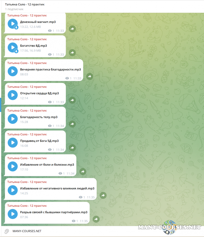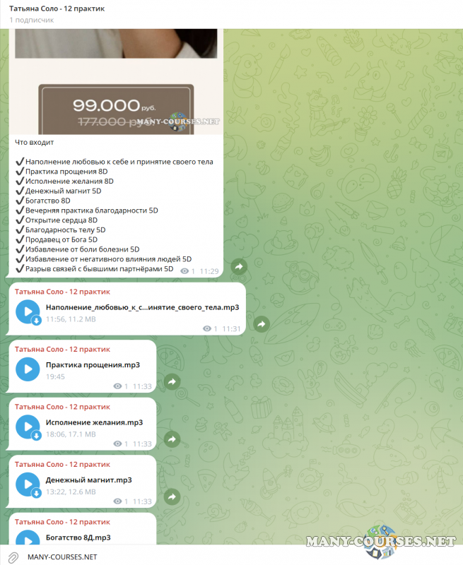 Вы находитесь на странице товара «Татьяна Соло - 12 практик», это материал 2024 года, который, мы надеемся, принесет вам пользу. Данный курс расположен на платформе «Канал Telegram».Скриншоты с платформы на которой расположены материалы вы можете найти выше. В нашем магазине курсы доступны по самым выгодным ценам. Вы получаете этот курс, купив в нашем магазине MANY-COURSES.NET, с огромной скидкой, всего 2590 рублей. Обучающий курс входит в рубрику «Психология / Эзотерика и оккультизм / Медитации», вы можете поискать другие сливы курсов в этой рубрике. В нашем магазине Вы найдёте ещё много курсов от автора «Татьяна Соло», достаточно ввести в поиск имя автора.
