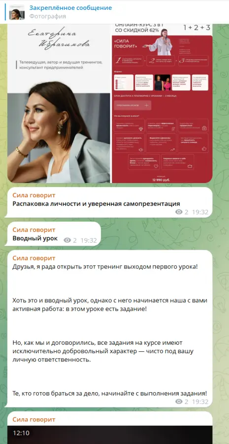 Вы находитесь на странице товара «Екатерина Ибрагимова - Сила говорит», это материал который, мы надеемся, принесет вам пользу. Данный курс расположен на платформе «Канал Telegram».Скриншоты с платформы на которой расположены материалы вы можете найти выше. В нашем магазине курсы доступны по самым выгодным ценам. Если бы вы покупали у самого автора, то данный курс вам обошелся 12990 рублей. Вы получаете этот курс, купив в нашем магазине MANY-COURSES.NET, с огромной скидкой, всего 990 рублей. Обучающий курс входит в рубрику «Психология», вы можете поискать другие сливы курсов в этой рубрике. В нашем магазине Вы найдёте ещё много курсов от автора «Екатерина Ибрагимова», достаточно ввести в поиск имя автора.