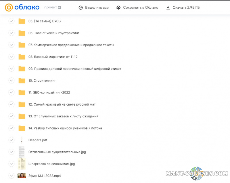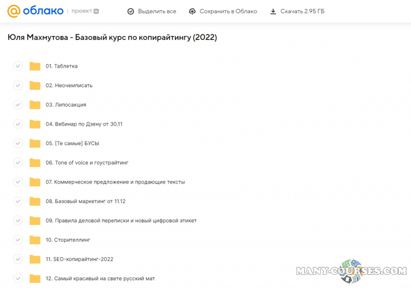 Вы находитесь на странице товара «Юля Махмутова - Базовый курс по копирайтингу», это материал 2022 года, который, мы надеемся, принесет вам пользу. Данный курс расположен на платформе «Облако Mail».Скриншоты с платформы на которой расположены материалы вы можете найти выше. В нашем магазине курсы доступны по самым выгодным ценам. Вы можете перейти на оригинальный продажник, после чего принять решение о покупке. Вы получаете этот курс, купив в нашем магазине MANY-COURSES.NET, с огромной скидкой, всего 349 рублей. Обучающий курс входит в рубрику «Саморазвитие и мотивация», вы можете поискать другие сливы курсов в этой рубрике. В нашем магазине Вы найдёте ещё много курсов от автора «Юля Махмутова», достаточно ввести в поиск имя автора.