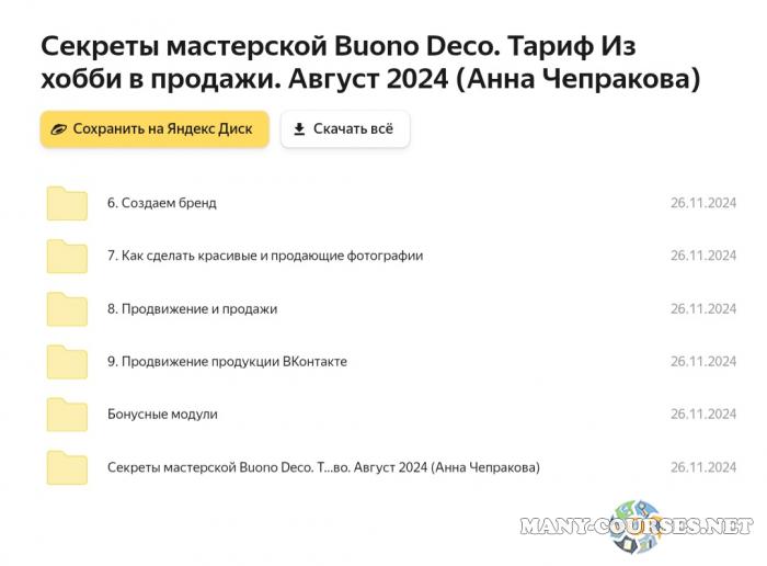 Вы находитесь на странице товара «Анна Чепракова - Секреты мастерской Buono Deco. Тариф Из хобби в продажи», это материал 2024 года, который, мы надеемся, принесет вам пользу. Данный курс расположен на платформе «Яндекс Диск».Скриншоты с платформы на которой расположены материалы вы можете найти выше. В нашем магазине курсы доступны по самым выгодным ценам. Вы получаете этот курс, купив в нашем магазине MANY-COURSES.NET, с огромной скидкой, всего 2390 рублей. Обучающий курс входит в рубрику «Саморазвитие и мотивация», вы можете поискать другие сливы курсов в этой рубрике. В нашем магазине Вы найдёте ещё много курсов от автора «Анна Чепракова», достаточно ввести в поиск имя автора.