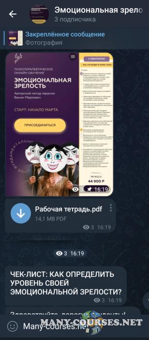 Вы находитесь на странице товара «Симург / Вания Маркович - Эмоциональная зрелость 2025. Тариф С ментором», это материал 2025 года, который, мы надеемся, принесет вам пользу. Данный курс расположен на платформе «Канал Telegram».Скриншоты с платформы на которой расположены материалы вы можете найти выше. В нашем магазине курсы доступны по самым выгодным ценам. Вы можете перейти на оригинальный продажник, после чего принять решение о покупке. Если бы вы покупали у самого автора, то данный курс вам обошелся 49900 рублей. Вы получаете этот курс, купив в нашем магазине MANY-COURSES.NET, с огромной скидкой, всего 2890 рублей. Обучающий курс входит в рубрику «Саморазвитие и мотивация / Эзотерика и оккультизм / Психология», вы можете поискать другие сливы курсов в этой рубрике. В нашем магазине Вы найдёте ещё много курсов от автора «Вания Маркович», достаточно ввести в поиск имя автора.