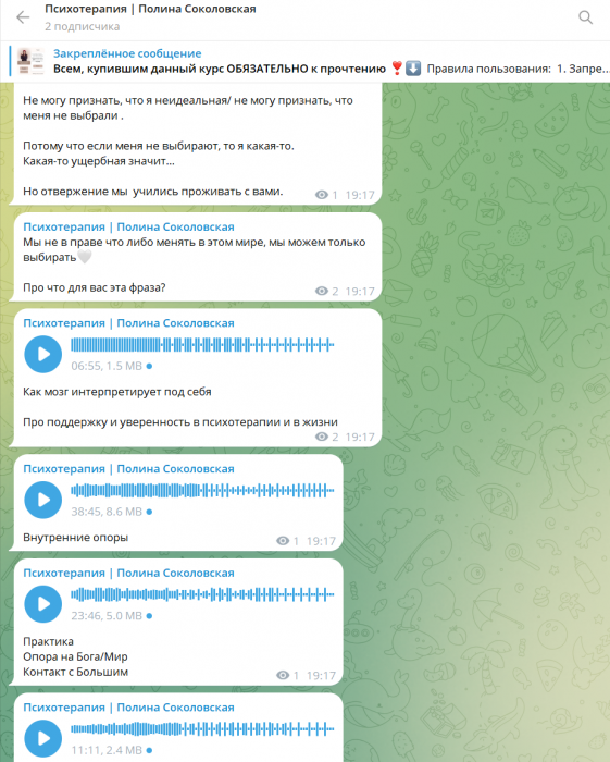 Вы находитесь на странице товара «Полина Соколовская - Психотерапия», это материал который, мы надеемся, принесет вам пользу. Данный курс расположен на платформе «Канал Telegram».Скриншоты с платформы на которой расположены материалы вы можете найти выше. В нашем магазине курсы доступны по самым выгодным ценам. Если бы вы покупали у самого автора, то данный курс вам обошелся 19999 рублей. Вы получаете этот курс, купив в нашем магазине MANY-COURSES.NET, с огромной скидкой, всего 780 рублей. Обучающий курс входит в рубрику «Саморазвитие и мотивация / Эзотерика и оккультизм / Психология», вы можете поискать другие сливы курсов в этой рубрике. В нашем магазине Вы найдёте ещё много курсов от автора «Полина Соколовская», достаточно ввести в поиск имя автора.