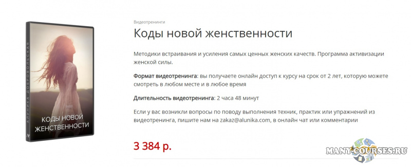 Вы находитесь на странице товара «Алуника Добровольская - Коды новой женственности», это материал 2020 года, который, мы надеемся, принесет вам пользу. Данный курс расположен на платформе «Облако Mail».Скриншоты с платформы на которой расположены материалы вы можете найти выше. В нашем магазине курсы доступны по самым выгодным ценам. Вы можете перейти на оригинальный продажник, после чего принять решение о покупке. Если бы вы покупали у самого автора, то данный курс вам обошелся 3384 рублей. Вы получаете этот курс, купив в нашем магазине MANY-COURSES.NET, с огромной скидкой, всего 200 рублей. Обучающий курс входит в рубрику «Саморазвитие и мотивация / Эзотерика и оккультизм / Психология», вы можете поискать другие сливы курсов в этой рубрике. В нашем магазине Вы найдёте ещё много курсов от автора «Алуника Добровольская», достаточно ввести в поиск имя автора.