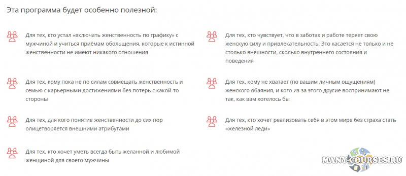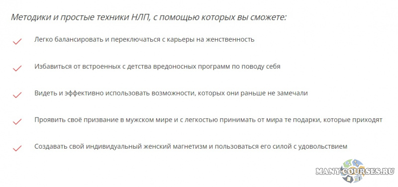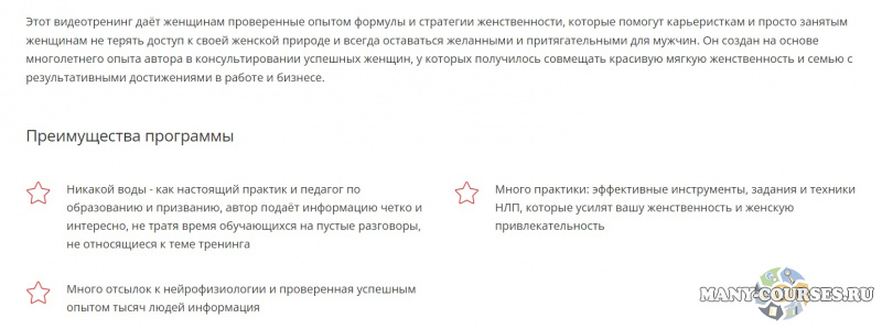 Этот видеотренинг даёт женщинам проверенные опытом формулы и стратегии женственности, которые помогут карьеристкам и просто занятым женщинам не терять доступ к своей женской природе и всегда оставаться желанными и притягательными для мужчин. Он создан на основе многолетнего опыта автора в консультировании успешных женщин, у которых получилось совмещать красивую мягкую женственность и семью с результативными достижениями в работе и бизнесе.