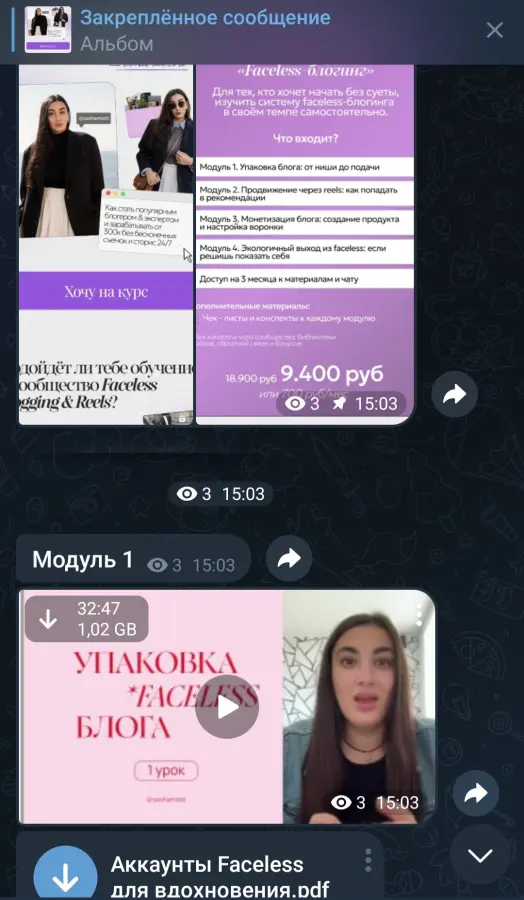 Вы находитесь на странице товара «sashamistt / Саша Мистт, Александра Шевченко - Faceless Blogging & Reels. Тариф Мини-курс Faceless-блогинг», это материал который, мы надеемся, принесет вам пользу. Данный курс расположен на платформе «Канал Telegram».Скриншоты с платформы на которой расположены материалы вы можете найти выше. В нашем магазине курсы доступны по самым выгодным ценам. Вы можете перейти на оригинальный продажник, после чего принять решение о покупке. Если бы вы покупали у самого автора, то данный курс вам обошелся 9400 рублей. Вы получаете этот курс, купив в нашем магазине MANY-COURSES.NET, с огромной скидкой, всего 779 рублей. Обучающий курс входит в рубрику «SEO и SMM», вы можете поискать другие сливы курсов в этой рубрике. В нашем магазине Вы найдёте ещё много курсов от автора «Саша Мистт, Александра Шевченко», достаточно ввести в поиск имя автора.