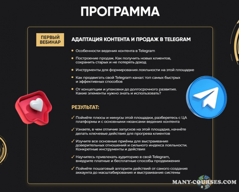 Какие элементы нужно знать и использовать?Как продвигать свой Telegram канал: топ самых быстрых и эффективных способовИнструменты для формирования лояльности на этой площадкеПостроение продаж. Как получить новых клиентов, сохранить старых и не потерять доходОсобенности ведения контента в Telegram