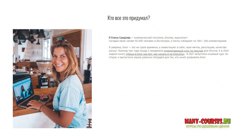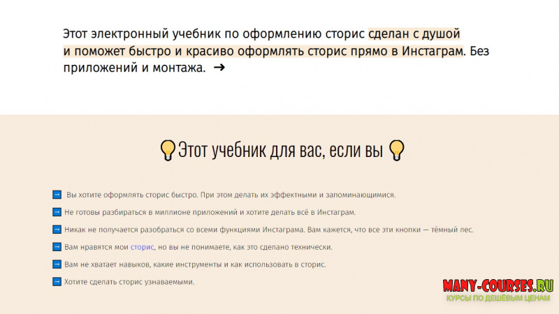 Вы находитесь на странице товара «Елена Сахарова - Учебник по оформлению сторис (2021)», это материал 2021 года, который, мы надеемся, принесет вам пользу. Скриншоты с платформы на которой расположены материалы вы можете найти выше. В нашем магазине курсы доступны по самым выгодным ценам. Вы можете перейти на оригинальный продажник, после чего принять решение о покупке. Если бы вы покупали у самого автора, то данный курс вам обошелся 540 рублей. Вы получаете этот курс, купив в нашем магазине MANY-COURSES.NET, с огромной скидкой, всего 99 рублей. Обучающий курс входит в рубрику «SEO и SMM», вы можете поискать другие сливы курсов в этой рубрике. В нашем магазине Вы найдёте ещё много курсов от автора «Елена Сахарова», достаточно ввести в поиск имя автора.